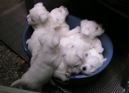 unsere Welpen gibt es noch - nur lassen die sich mittlerweile nicht immer auf so kleinem Raum unterbringen, wie auf dem Bild. Wir haben einen Pavillon auf der Terrasse stehen, wo sich die Bande den ganzen Tag aufhält. Wenn, was ja immer seltener vorkommt, eine der Mütter zum Büffet vorbeischaut, hängt die ganze Truppe gleich an der Milchbar - egal, welche von den beiden gerade eine Runde ausgibt.