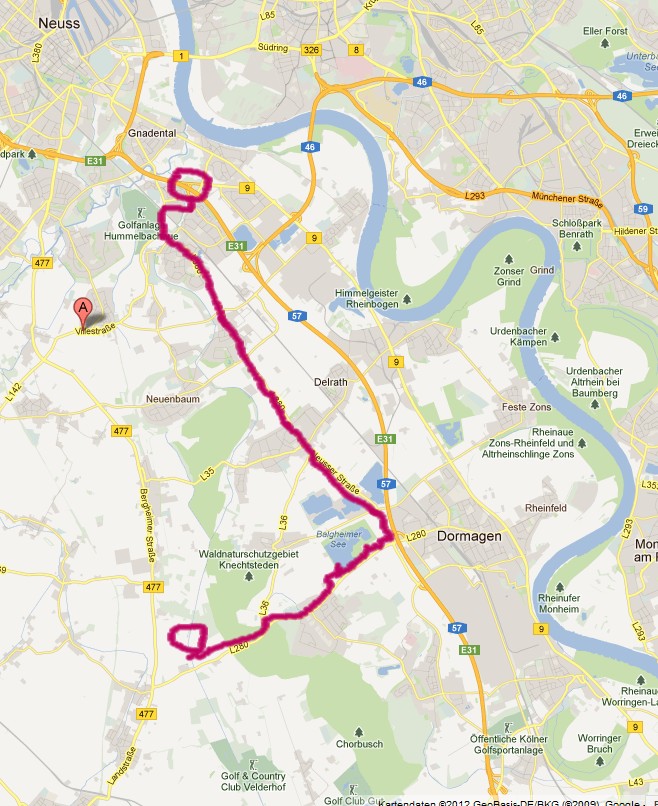An der 1. Ampel LINKS in den Ort Norf einfahren, durchfahren, ein Stück Landstraße, dann kommt Ihr durch den Ort "Allerheiligen" (nicht wundern, da haben sie einen abenteuerlichen Parcours zur Tempodrosseldung erbaut), dann wieder Landstraße und Ihr durchfahrt den Ort Nievenheim.