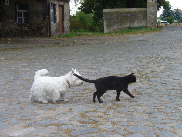 Ich muss dazu sagen, dass wir hier so eine blöde Hofmiezi haben und der kann man im wahrsten Sinne des Wortes nicht übern Weg trauen. Die macht schon von weitem einen Buckel und faucht, wenn sie Bonnie sieht, dabei sind die sich noch nie in die Quere gekommen. Aber ich habs bis jetzt auch immer unterbunden, wenn Bonnie zur Jagd ansetzen wollte, weil ich nich weiss, ob Bonnies Nase hinterher noch dran ist... wär mir zu riskant! Daher vielleicht das Vorsichtige bei der anderen Miezi - die war ja auch noch klein...