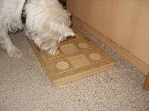 also paco ist egal was ich mache sofort feuer und flamme. leider verliert er schnell die lust. und allein spielen findet er doof. im gegesatz zu tommi der auch mal mit sich selbst spielte und gedankenverloren ball oder kauknochen ( nicht essbar ) tracktiert hat. umso schöner das er mit callum und unserem kater abu zwei spielkumpels immer verfügbar hat . da er mit futter leicht zu lenken ist habe ich für ihn von einer meiner damen vom hundeplatz ein paar dieser hölzernen futtersuchspielzeuge geliehen für die er sich schier umbringt ( zum glück hat er noch nicht gemerkt,das der inhalt seiner futterration abgezogen wird ) - wehe mir -. bei diesen spielen taucht er völlig ein und ist voll gefordert. ich mach mal fotos davon. vorher muss er sich allerdings in selbstdisziplin üben und in gebührendem abstand auf dem teppich abwarten bis ich das spiel mit kommando freigebe ( man könnte meinen der teppich brennt so unruhig rutscht er hin und her ) diese selbstdisziplin verlange ich auch vor jeder mahlzeit . er darf erst an seinen napf wenn er das kommando guten appetit ( kein witz ) bekommt. das hat seinerzeit seine züchterin als eine seiner erziehungsgrundlagen gelegt. überhaupt hat sie ganz tolle vorarbeit geleistet. so kannte er verbleiben in der box . autofahren, angeleint abliegen ohne zu nölen was uns zwei tage nachdem ich ihn zu uns holte schon neidische blicke und anerkennung für diesen toll erzogenen hund einbrachte - wir waren zum grillen und er muste ausserhalb der reichweite seiner leine abseits des tisches abliegen solange wir aßen. er lag sehr ruhig wie selbstverständlich da während die anderen anwesenden etwa 10 hunde nölten und bettelten ( callum inclusive ) was das zeug hielt. paco war der kleinste und hätte am wenigsten gestört aber er war solange wir aßen einfach unsichtbar