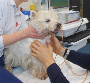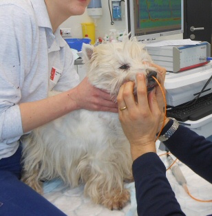 Die Hunde müssen einen Schlauch schlucken. Damit wird die Motorik der Speiseröhre überprüft.