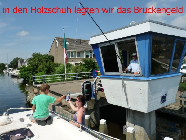 Die Knoten fürs Festmachen an Land fand ich klasse, sind dieselben die ich immer mit meiner Wäscheleine auf dem Hof mache... kannte ich also schon. Am nächsten Tag gings dann richtig los. Wir fuhren genau nach Wasserkarte (da waren Bojen drauf, welche wir mit dem Fernglas in echt verfolgen konnten), anders hätten wir uns gar nicht zurecht gefunden. Das war schon spannend! Dann passierten wir BB- das sind bewegliche Brücken, die hochgezogen werden mussten und für deren Passage wir dann das s.g. Brückengeld in einen Holzschuh werfen durften.