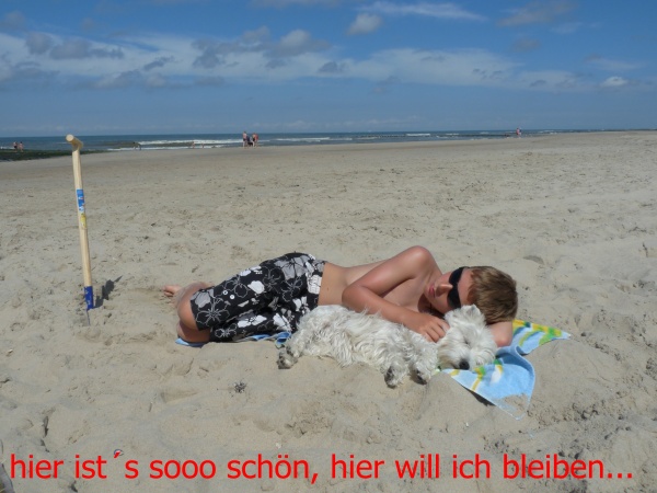 Bonnie hat dort auch ganz viele Hunde kennen gelernt, ein Jack Russel wollte aber so gar nichts von ihr wissen, hatte mit seinem Frauchen "Bällchenwerfen" gespielt und Bonnie ist immer dem Jacki hinterher geflitzt, wenn der den Ball geholt hat - wir haben uns kugelig gelacht, sah echt zum Schießen aus. Als er sein Bällchen hatte, hat Bonnie ihn dann auch eingeholt und ihn in die Seite geknufft, so wie: "jetzt hab ich dich..." da ging bestimmt ne halbe Stunde so... Zuhause hat sie dann geschlafen wie ein Stein! War fix und fertig: Ach - und Sandbuddeln haben wir ihr beigebracht... ja es gibt Hunde, die machen sowas nicht! Jetzt kann sie es